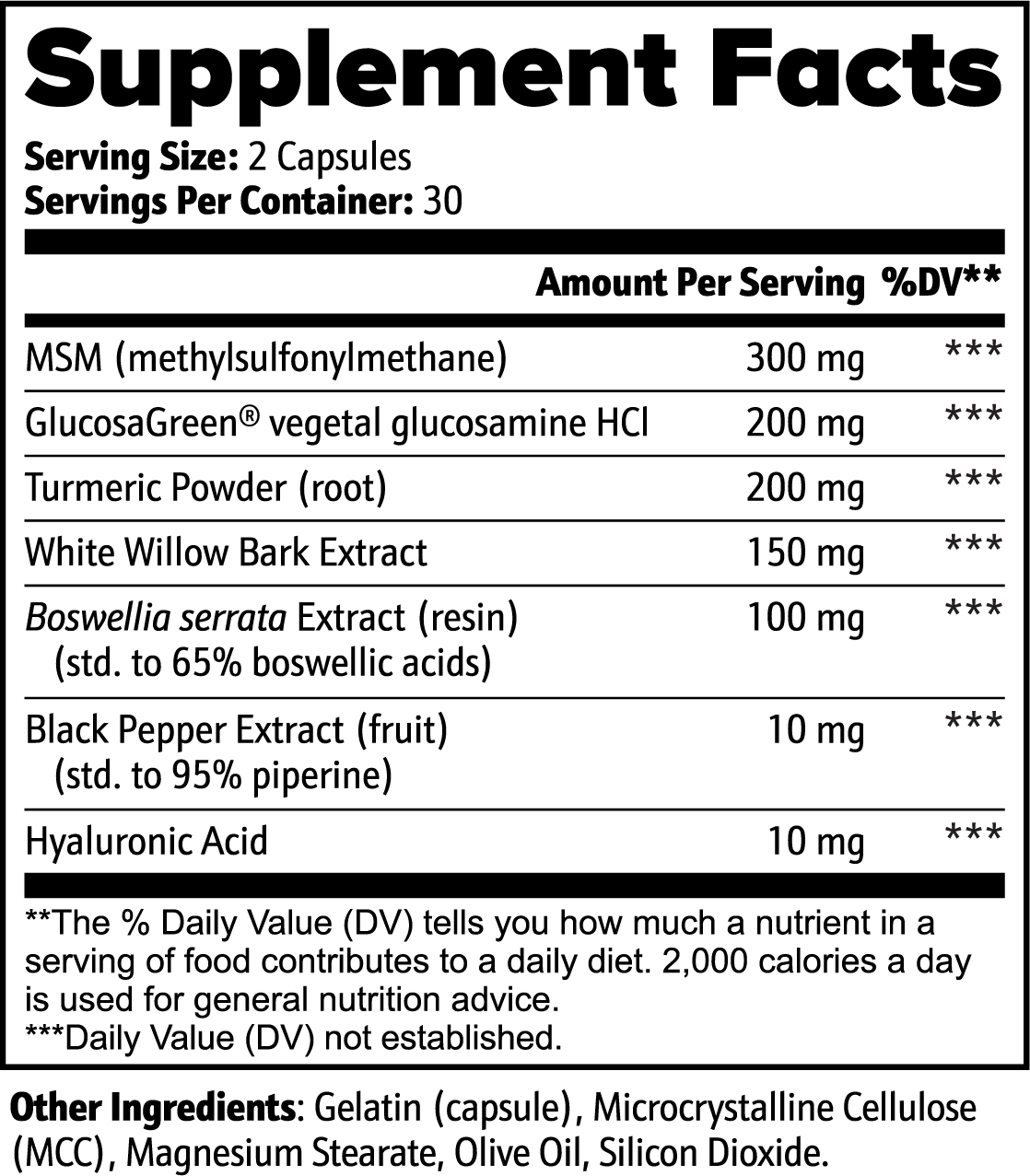 Ingredients: MSM (methylsulfonylmethane), GlucosaGreen® vegetal glucosamine HCl, Turmeric Powder (root), White Willow Bark Extract, Boswellia serrata Extract (resin)(std. to 65% boswellic acids), Black Pepper Extract (fruit) (std. to 95% piperine), Hyaluronic Acid, Gelatin (capsule), Microcrystalline Cellulose (MCC), Magnesium Stearate, Olive Oil, Silicon Dioxide.