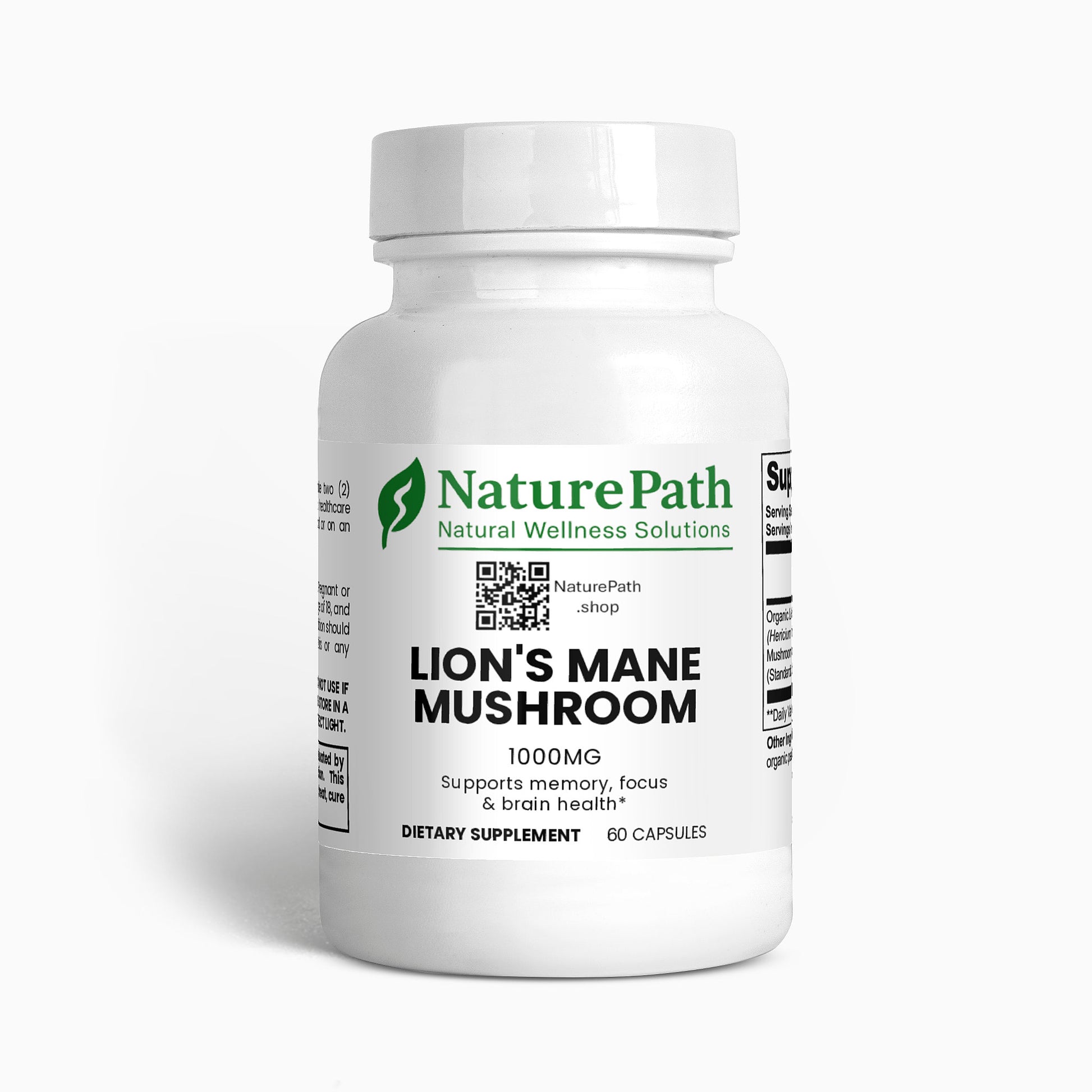 Ingredients: Organic Lion’s Mane (Hericum erinaceus) Mushroom Fruiting Body & Mycelium Powder (Standardized to 40% polysaccharides [400mg]), Organic capsule (pullulan, water), organic pea starch.